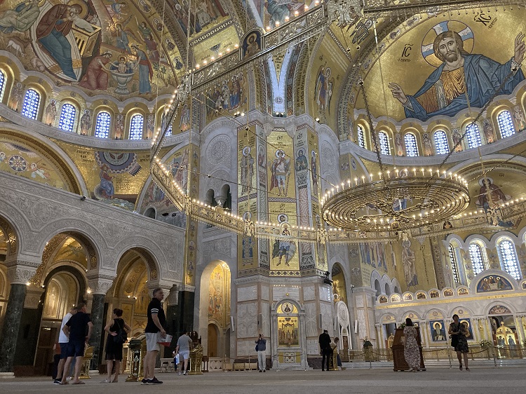 Kahden vuoden jälkeen, korona-ajan pakottamana poissa olleina, palasimme nyt katsomaan, mihin vaiheeseen Hram on edennyt. Pääsali on lähes valmis, enää yksi seinä on vielä peitettynä. Harmaat matot peittävät lattiaa, joten todennäköisesti lattiapintakin vielä viimeistellään. On vaikea uskoa, että messuhallimaiset matot jäisivät paikoilleen, kun kaikkialla ympärillä kimmeltää kulta ja alhaalla kryptassakin on marmorilattia.
