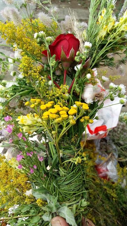 Banevo Brdon kukkakauppiailta vietiin kukkaseppeleet suoraan käsistä ja naisten sormet näpräsivät sitä mukaa uusia.