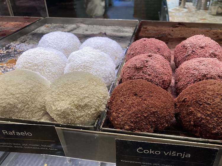 Originelli nuori myyjätär Katarina jutteli iloisesti ja esitteli pientä keittiötä tiskin takana, jossa knedlet kiehuivat kattiloissaan. Taatusti tuoreita tuotteita siis, eivätkä knedlet kovin kauaa ehtineet vitriineissä viipyä. Edullisiakin olivat: 110-190 dinaaria eli noin 0,90 – 1,60 euroa kappale (kesällä 2022). Asiakkaita kävi tasaiseen tahtiin.