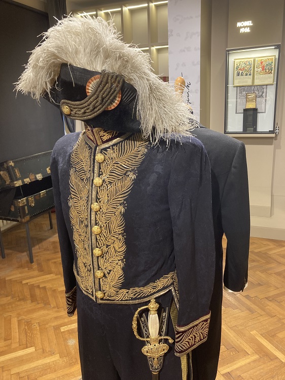 Ivo Andrić tunnetaan vuoden 1961 Nobelin kirjallisuuspalkinnon saajana. Ennen kirjailijan statustaan hän työskenteli pitkään Jugoslavian kuningaskunnan diplomaattina eri puolilla Eurooppaa. Ensimmäinen asemapaikka vuonna 1919-1920 oli Vatikaanissa, sillä hän osasi sekä italiaa että latinaa. Hän oli muutoinkin sen ajan oloihin (ja nykyisiinkin) poikkeuksellisen kielitaitoinen. Yllä olevassa kuvakokoelmassa on hänen diplomaattipassinsa ja näyttävä edustuspuku: töyhtöhattu, koristeellinen takki kultanappeineen sekä miekka. Selätysten toisella puolella on asu, joka Andrićilla oli yllä Nobelin palkintojenjakotilaisuudessa Tukholmassa.