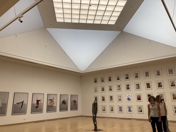 Isoista ikkunoista lankeava luonnonvalo sallii teosten hengittää. Näyttelytilan kerroksellisuus on myös vaikuttava.